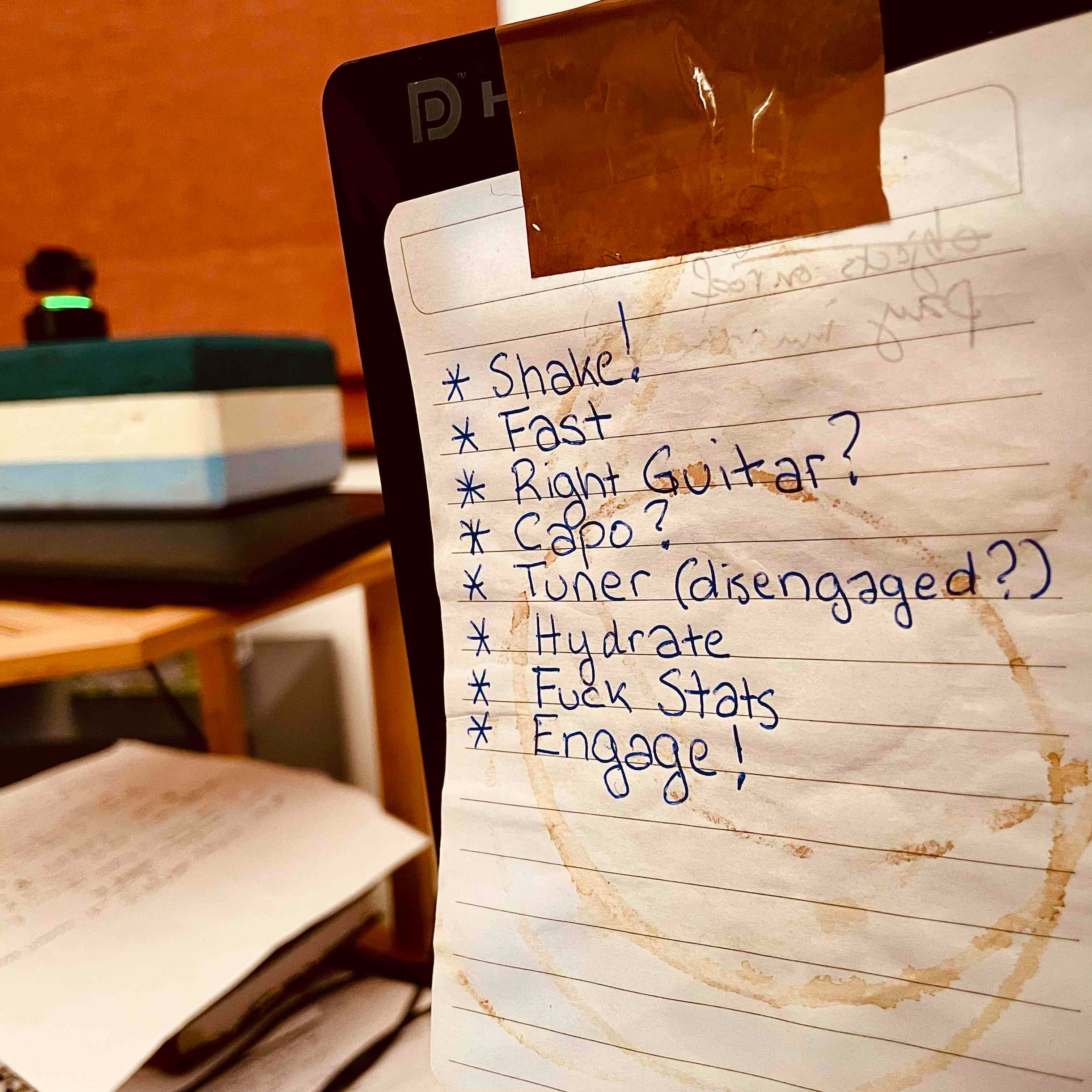 As a guitarist, I have a tendency to look unto my fret board while playing the guitar. During a livestream, this makes my head move away from the microphone and cuts off my voice. So I have a note that says ‘eat the microphone’ to remind myself to keep my lips close to the mic.